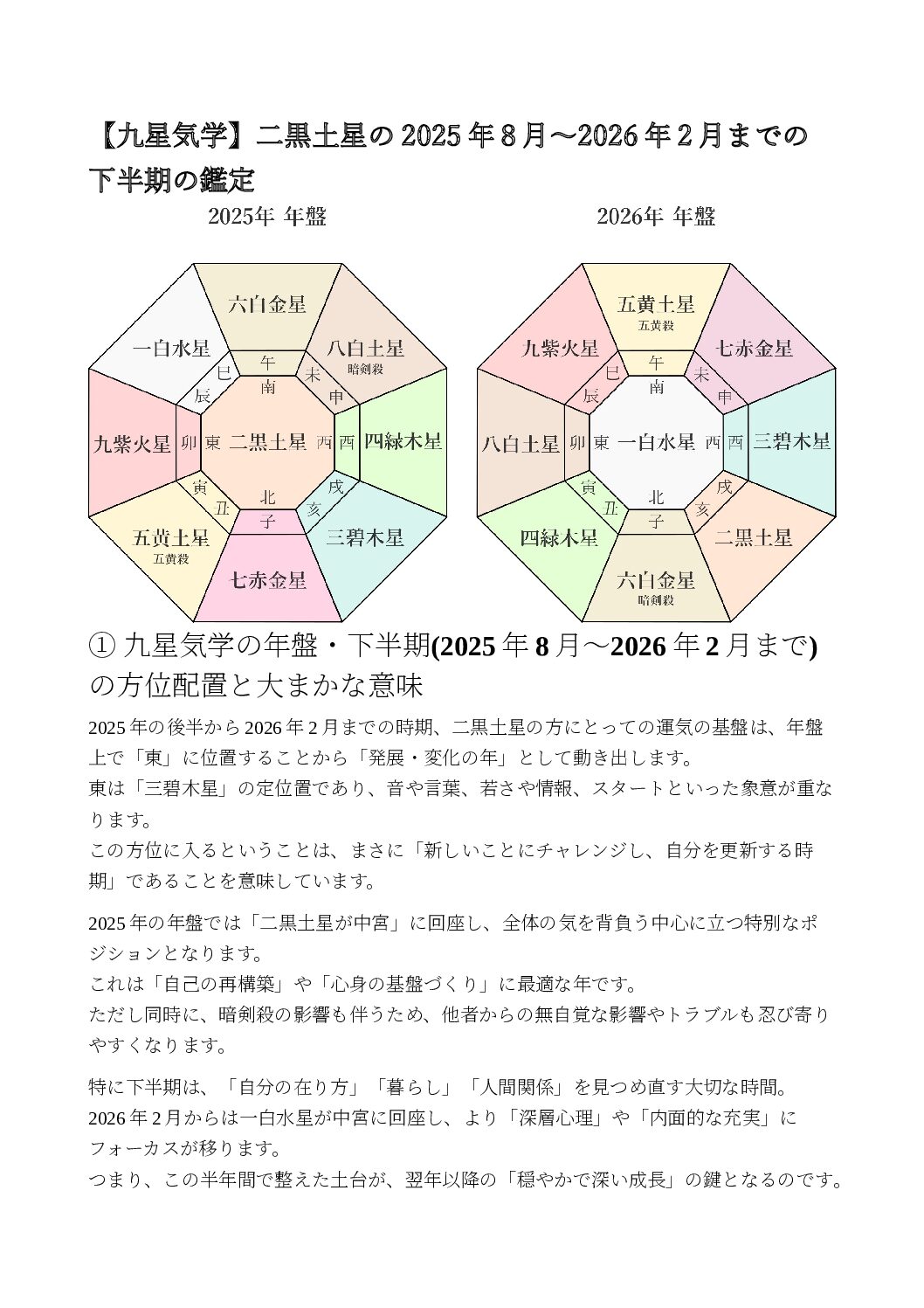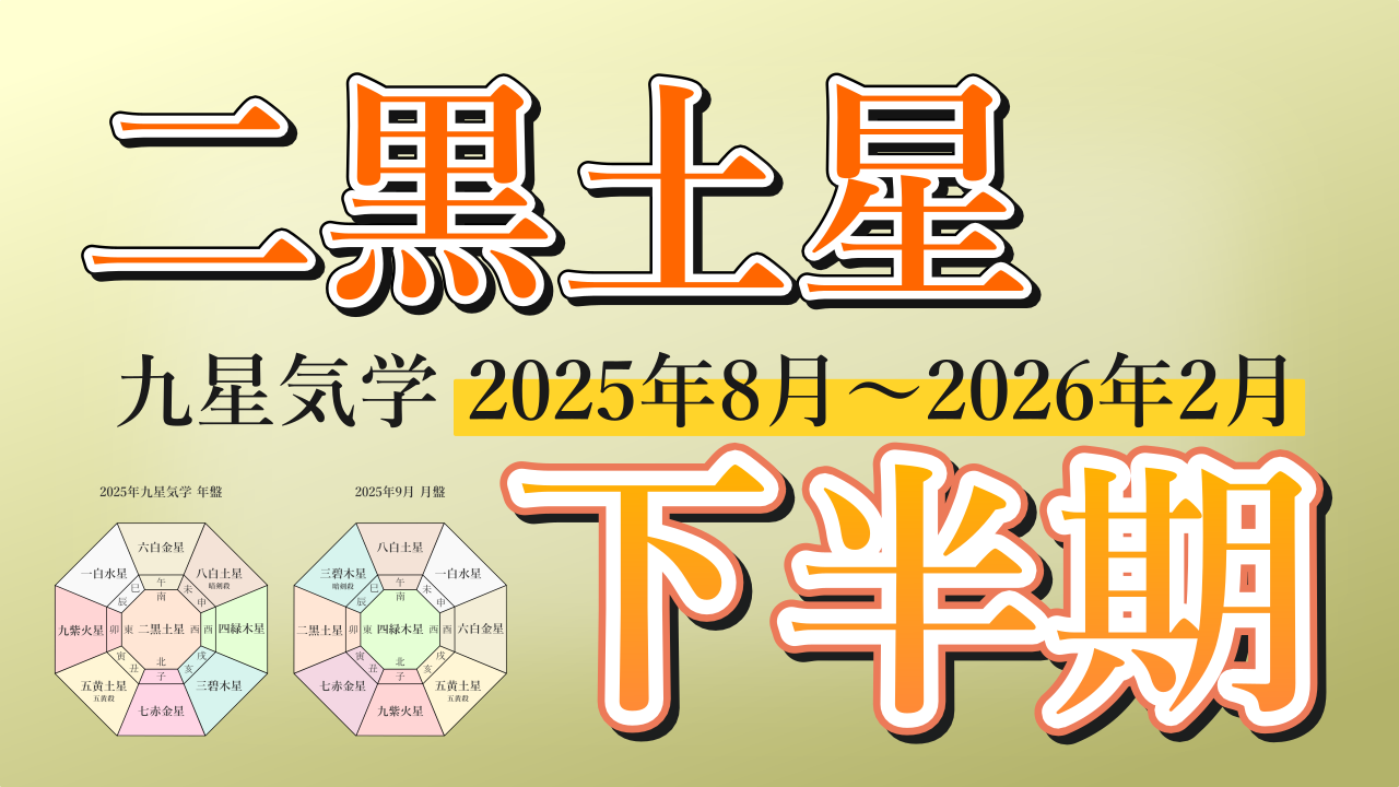 九星気学を用いて【二黒土星】の2025年8月~2026年2月まで、下半期の運勢をまとめた鑑定です。