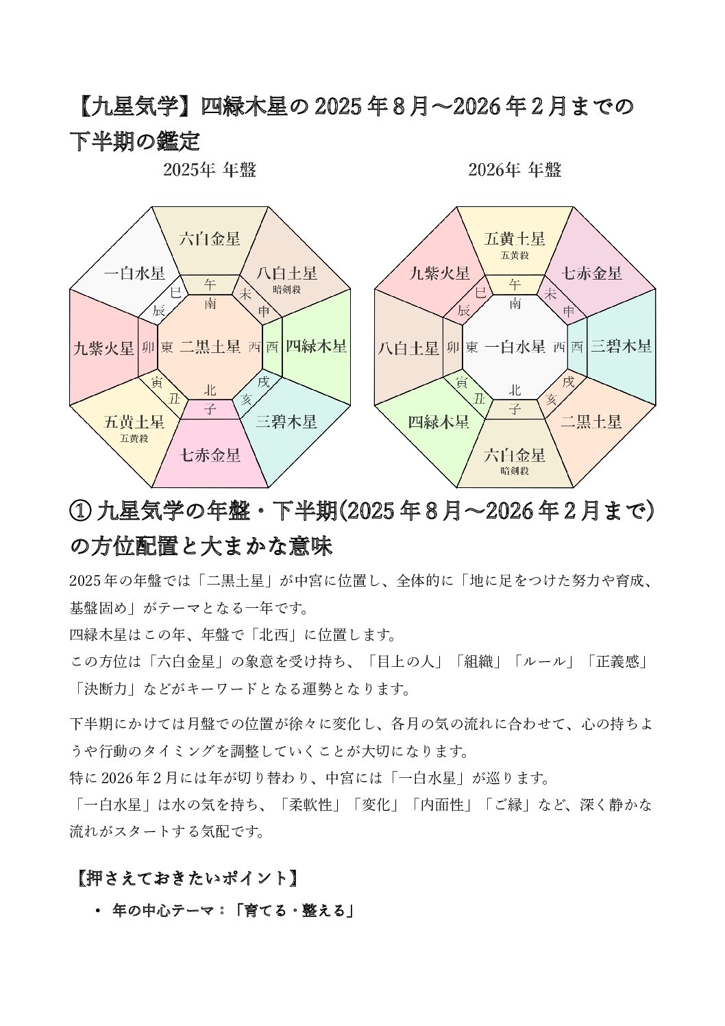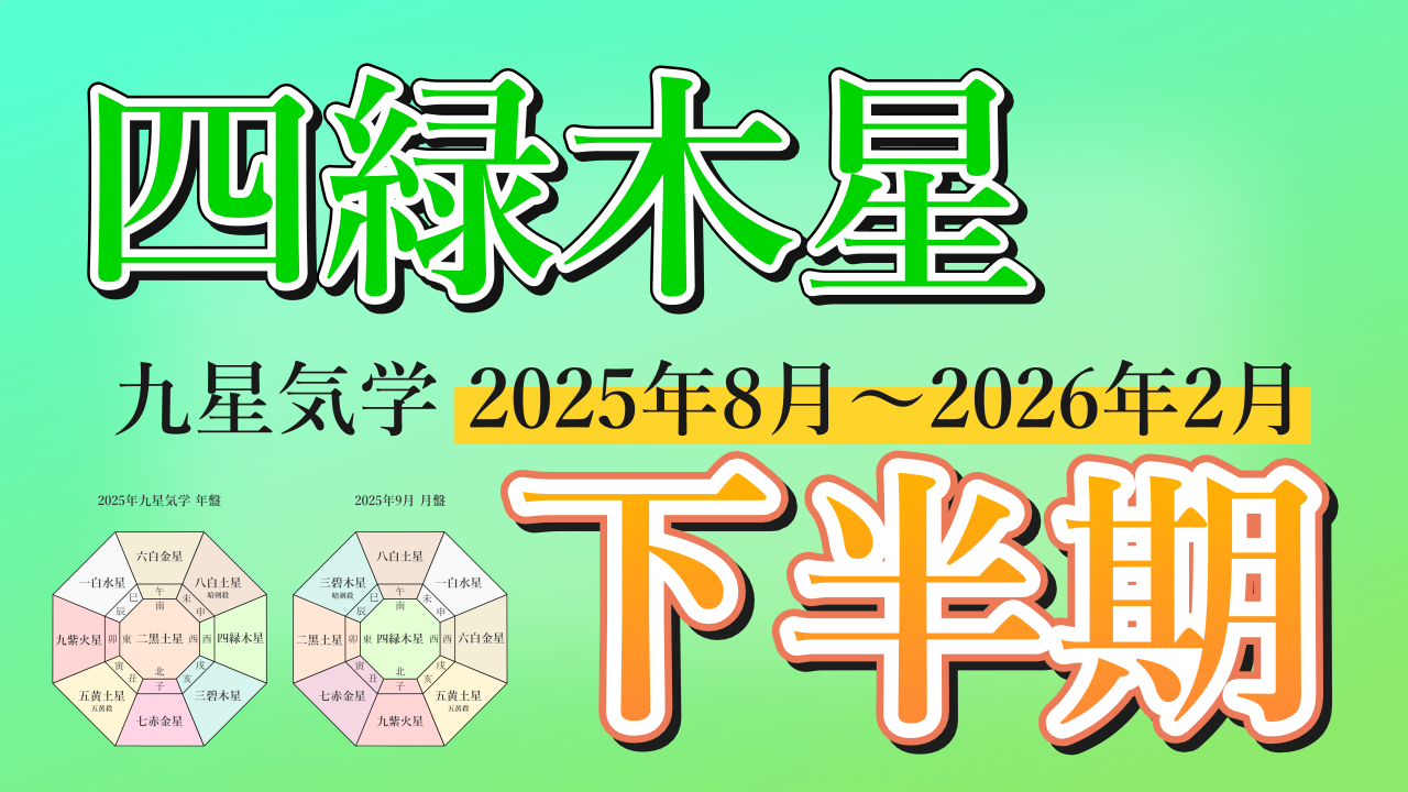 九星気学を用いて【四緑木星】の2025年8月~2026年2月まで、下半期の運勢をまとめた鑑定です。