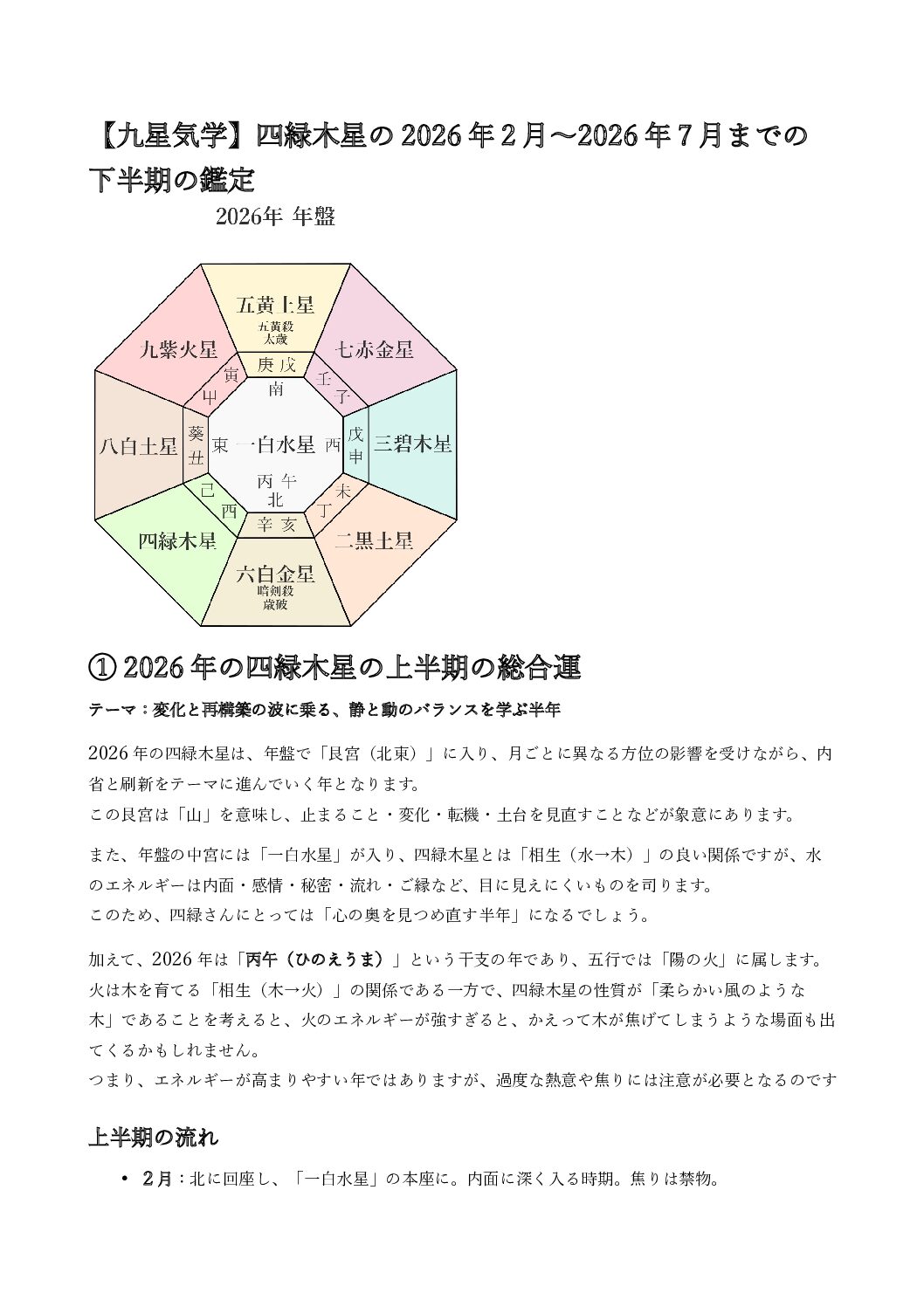 “【九星気学】四緑木星の2026年2月~2026年7月までの上半期の鑑定” の口コミを投稿します